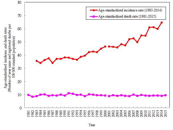 | Notes: | * | Age-standardised incidence / death rates are compiled based on the world standard population specified in GPE Discussion Paper Series: No.31, EIP/GPE/EBD, World Health Organization, 2001. |
