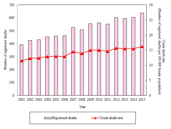 Number of registered deaths and crude death rate of breast cancer in females, 2001 to 2023 (View)