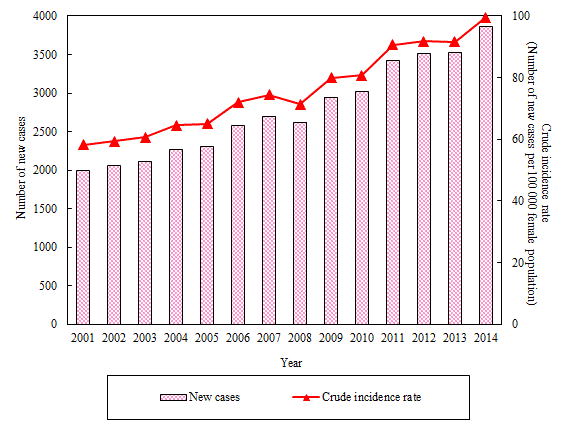 Number of new cases and crude incidence rate of breast cancer in females, 2001 to 2022 (View)