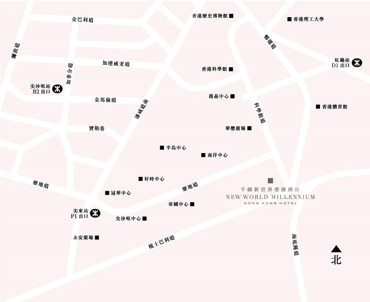 港鐵︰ 尖東港鐵站P1出口 尖沙咀港鐵站B2出口 紅磡港鐵站D1出口 停車場︰ 千禧新世界香港酒店只設有限量的收費停車位,並以先到先得形式供使用。 鄰近停車場︰帝國中心和尖沙咀中心
