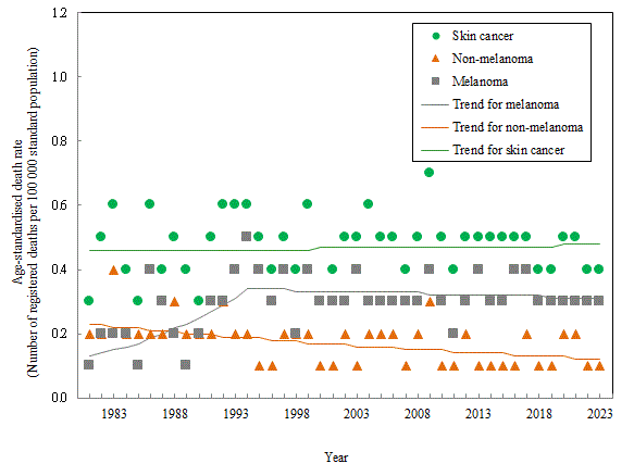 The age-standardised death rate of non-melanoma had a downward trend over the past 43 years (average annual percentage change (AAPC)# between 1981 and 2023: -1.5%) and over the past 10 years (AAPC between 2014 and 2023: -1.5%).