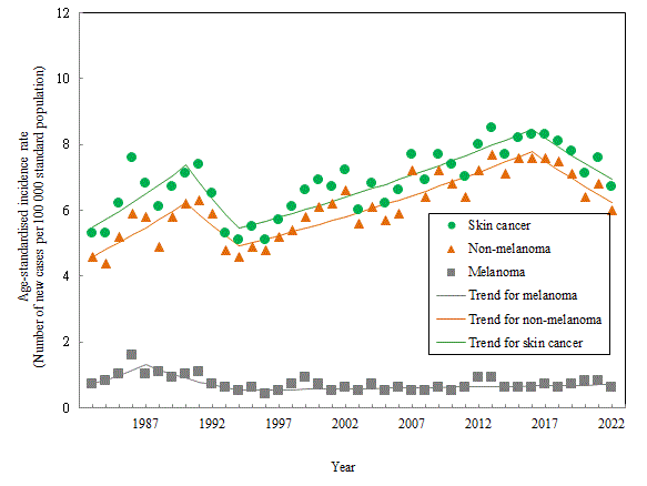 The age-standardised incidence rate of overall skin cancer (both non-melanoma and melanoma) and non-melanoma had no significant trend over the past 40 years and over the past 10 years.