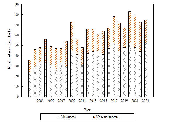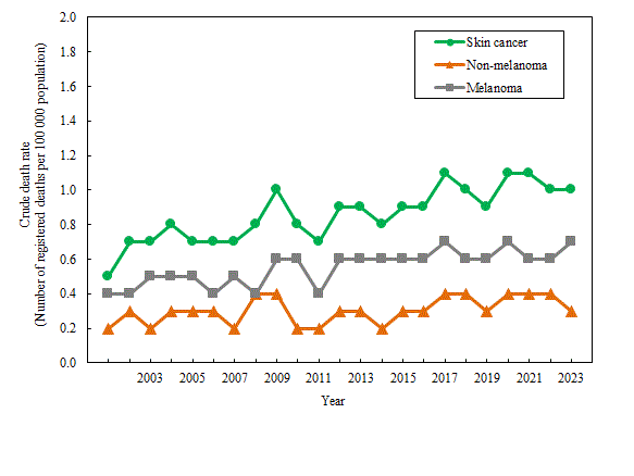 In 2023, a total of 75 people died from skin cancer which accounted for 0.5% of all cancer deaths. 23 deaths were due to non-melanoma and 52 deaths were due to melanoma. The crude death rates were 0.3 and 0.7 for non-melanoma and melanoma per 100 000 population respectively. The age-standardised death rates* for non-melanoma and melanoma were 0.1 and 0.3 per 100 000 standard population respectively.