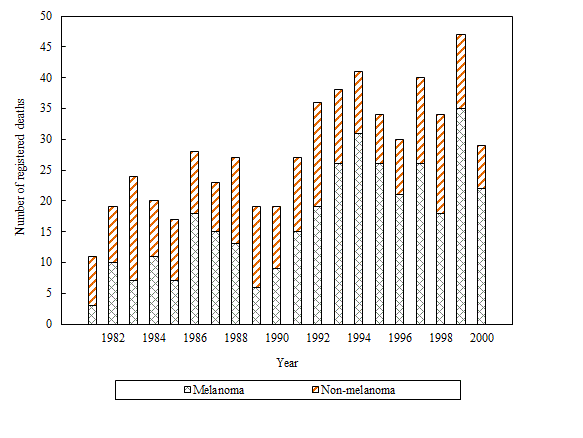 Number of registered deaths of skin cancer, 1981 to 2000 (View)