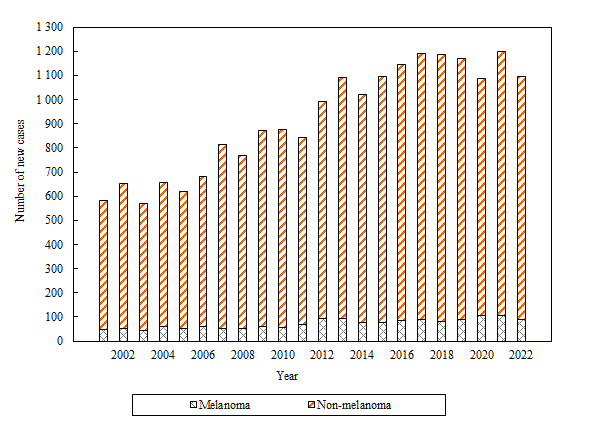 Number of new cases of skin cancer, 2001 to 2022 (View)