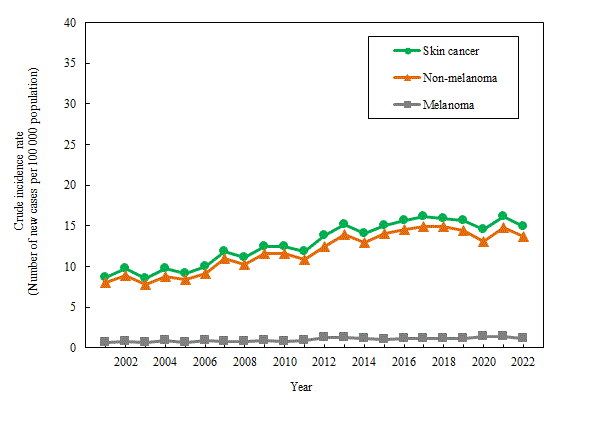 Number of crude incidence rate of skin cancer, 2001 to 2022 (View)