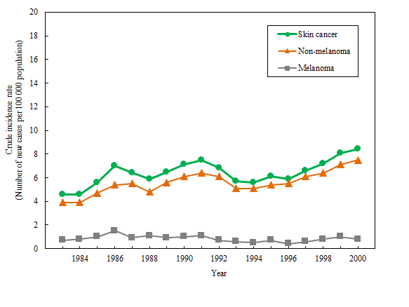 Number of crude incidence rate of skin cancer, 1983 to 2000 (View)