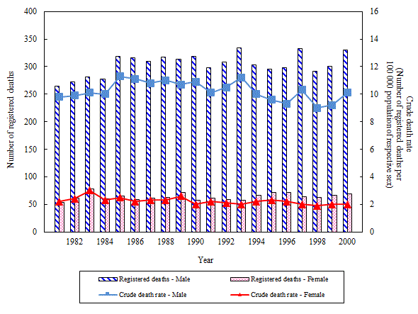 Number of registered deaths and crude death rate of oesophageal cancer by sex, 1981 to 2000 (View)