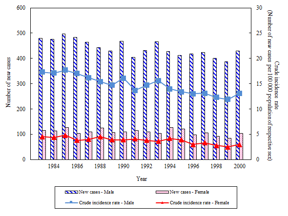 Number of new cases and crude incidence rate of oesophageal cancer by sex, 1983 to 2000 (View)