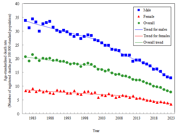 The age-standardised death rate of liver cancer of both sexes, males and females all had a downward trend over the past 43 years (average annual percentage change (AAPC)# between 1981 and 2023: -2.3%, -2.3% and -2.0% respectively) and over the past 10 years (AAPC between 2014 and 2023: -4.5%, -4.2% and -4.3% respectively).