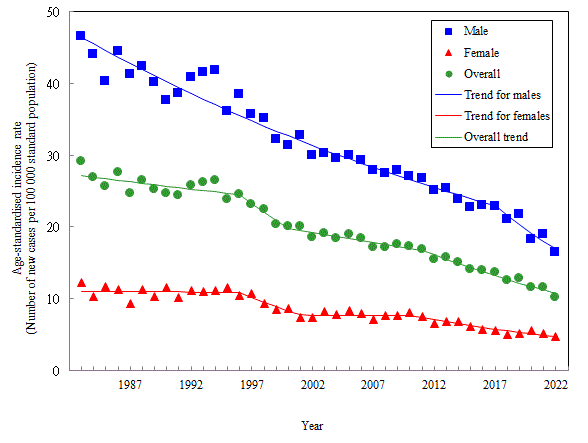 The age-standardised incidence rates of liver cancer of both sexes, males and females all had a downward trend over the past 40 years (average annual percentage change (AAPC)# between 1983 and 2022: -2.3%, -2.6% and -2.2% respectively) and over the past 10 years (AAPC between 2013 and 2022: -3.9%, -4.2% and -4.0% respectively).