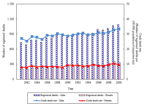 Number of registered deaths and crude death rate of liver cancer by sex, 1981 to 2000 (View)