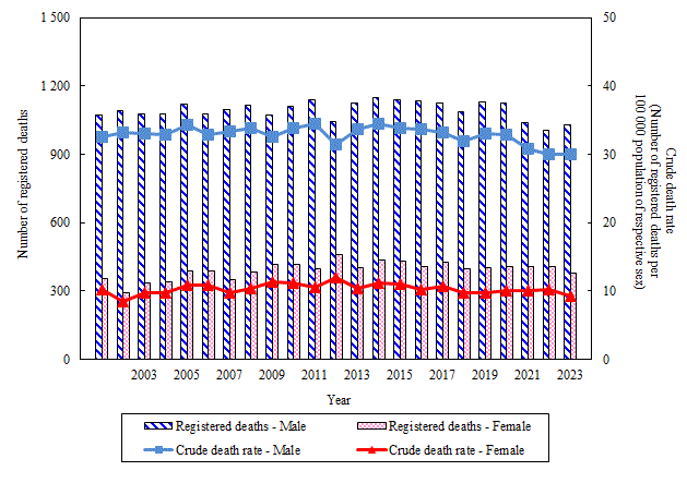 Number of registered deaths and crude death rate of liver cancer by sex, 2001 to 2023 (View)