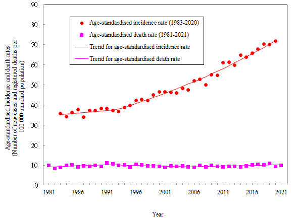 | Notes: | * | Age-standardised incidence / death rates are compiled based on the world standard population specified in GPE Discussion Paper Series: No.31, EIP/GPE/EBD, World Health Organization, 2001. |