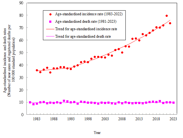 The age-standardised incidence rate of female breast cancer had an upward trend over the past 40 years (average annual percentage change (AAPC)# between 1983 and 2022: 2.0%) and over the past 10 years (AAPC between 2013 and 2022: 2.4%).