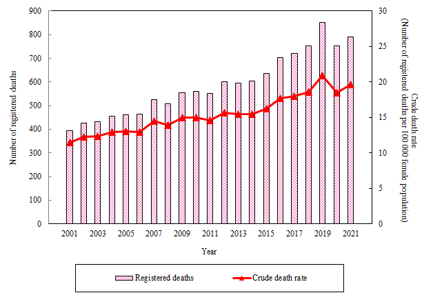 Number of registered deaths and crude death rate of breast cancer in females, 2001 to 2023 (View)