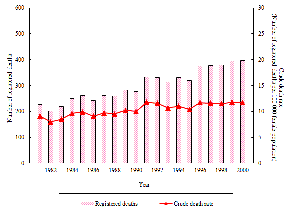 Number of registered deaths and crude death rate of breast cancer in females, 1981 to 2000 (View)