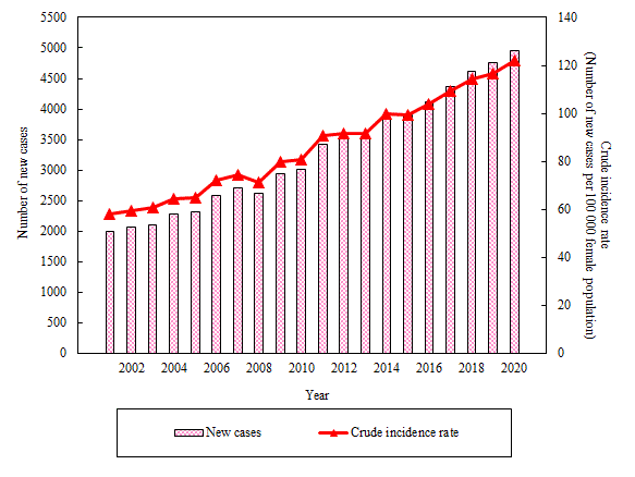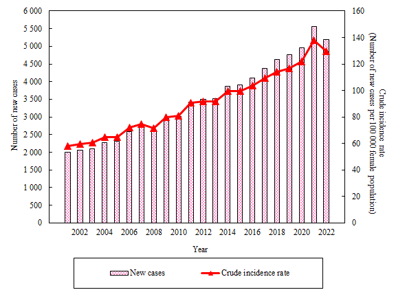 Number of new cases and crude incidence rate of breast cancer in females, 2001 to 2022 (View)