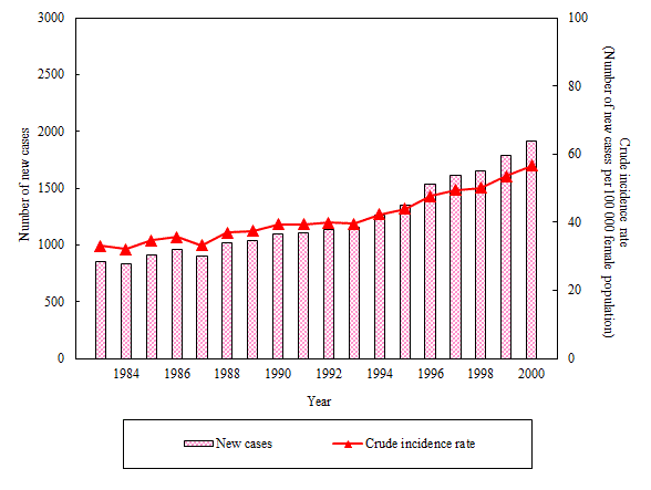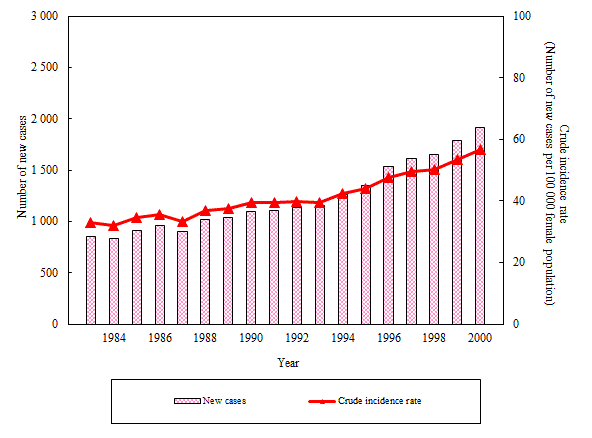 Number of new cases and crude incidence rate of breast cancer in females, 1983 to 2000 (View)
