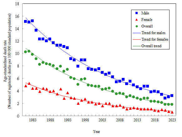 | Notes: | * | Age-standardised death rates are compiled based on the world standard population specified in GPE Discussion Paper Series: No.31, EIP/GPE/EBD, World Health Organization, 2001. |