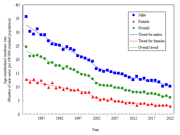| Notes: | * | Age-standardised incidence rates are compiled based on the world standard population specified in GPE Discussion Paper Series: No.31, EIP/GPE/EBD, World Health Organization, 2001. |