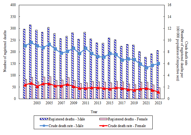| Classification of diseases and causes of death is based on the International Statistical Classification of Diseases and Related Health Problems (ICD) 10th Revision from 2001 onwards. Figures from 2001 onwards may not be comparable with figures for previous years which were compiled based on the ICD 9th Revision. | ||