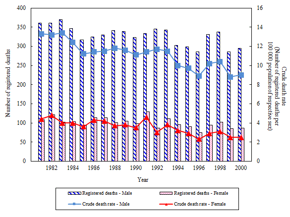 Number of registered deaths and crude death rate of nasopharyngeal cancer by sex, 1981 to 2000 (View)