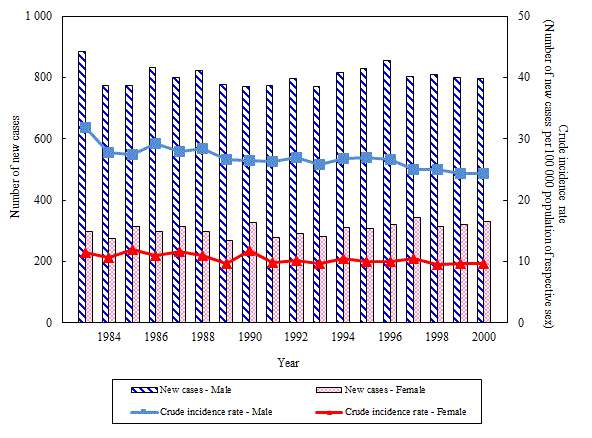 Number of new cases and crude incidence rate of nasopharyngeal cancer by sex, 1983 to 2000 (View)