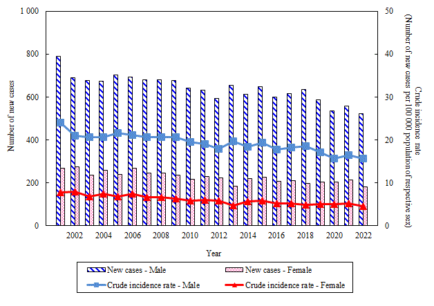 Number of new cases and crude incidence rate of nasopharyngeal cancer by sex, 2001 to 2022 (View)