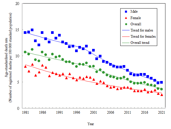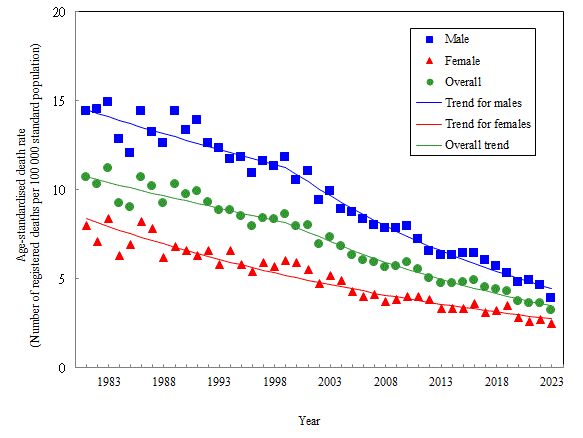 The age-standardised death rates of stomach cancer of both sexes, males and females all had a downward trend over the past 43 years (average annual percentage change (AAPC)# between 1981 and 2023: -2.6%, -2.8% and -2.6% respectively) and over the past 10 years (AAPC between 2014 and 2023: -3.5%, -3.8% and -2.6% respectively).