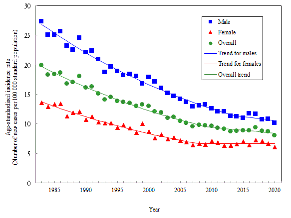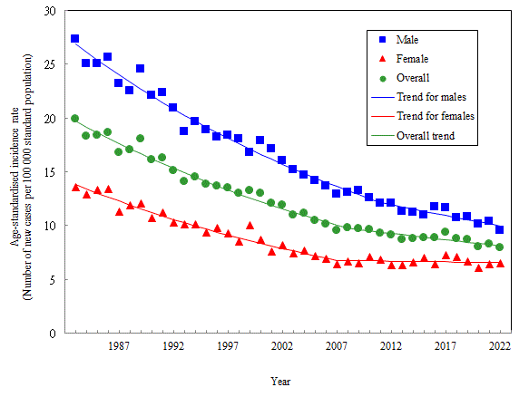 The age-standardised incidence rate of stomach cancer of both sexes and that of males had a downward trend over the past 40 years (average annual percentage change (AAPC)# between 1983 and 2022: -2.2% and -2.5% respectively) and over the past 10 years (AAPC between 2013 and 2022: -1.3% and -1.8% respectively).