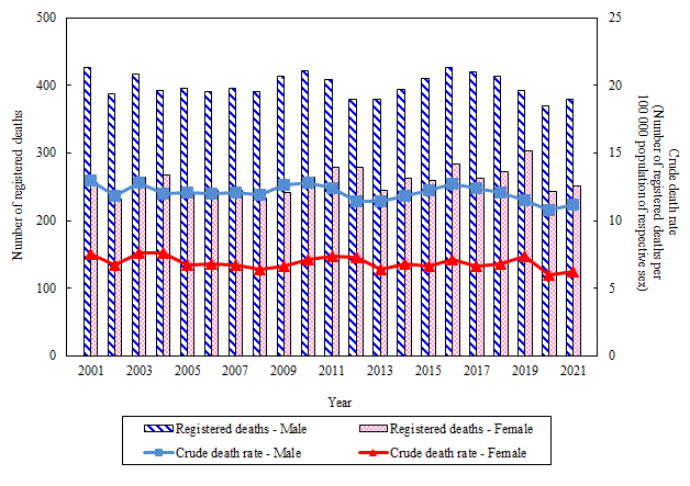 | Classification of diseases and causes of death is based on the International Statistical Classification of Diseases and Related Health Problems (ICD) 10th Revision from 2001 onwards. Figures from 2001 onwards may not be comparable with figures for previous years which were compiled based on the ICD 9th Revision. | ||