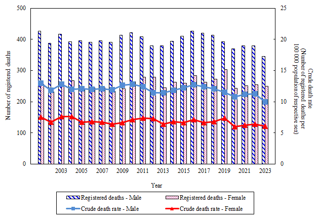 Number of registered deaths and crude death rate of stomach cancer by sex, 2001 to 2023 (View)