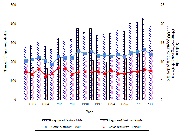 Number of registered deaths and crude death rate of stomach cancer by sex, 1981 to 2000 (View)