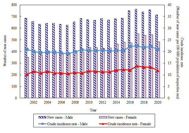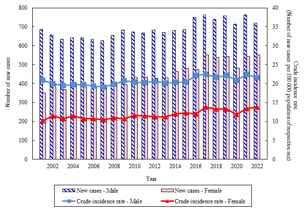 Number of new cases and crude incidence rate of stomach cancer by sex, 2001 to 2022 (View)