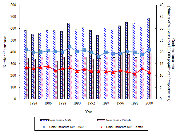 Number of new cases and crude incidence rate of stomach cancer by sex, 1983 to 2000 (View)