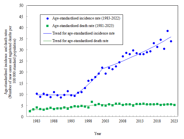 The age-standardised incidence rate of prostate cancer had an upward trend over the past 40 years (average annual percentage change (AAPC)# between 1983 and 2022: 3.4%) and over the past 10 years (AAPC between 2013 and 2022: 2.6%).