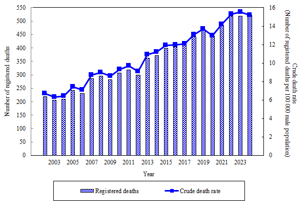 Number of registered deaths and crude death rate of prostate cancer, 2001 to 2023 (View)