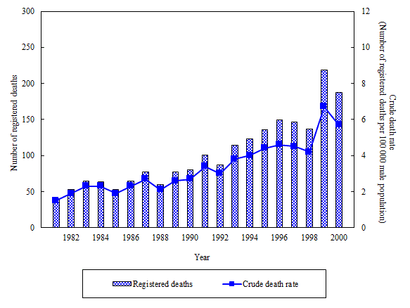 Number of registered deaths and crude death rate of prostate cancer, 1981 to 2000 (View)