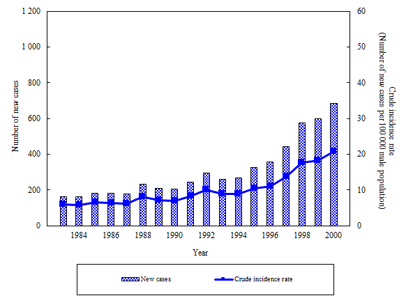 Number of new cases and crude incidence rate of prostate cancer, 1983 to 2000 (View)