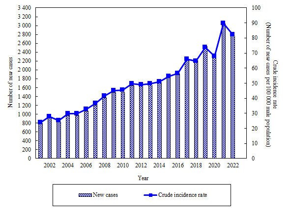 Number of new cases and crude incidence rate of prostate cancer, 2001 to 2022 (View)