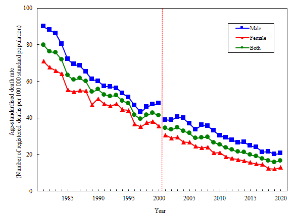 Classification of diseases and causes of death is based on the International Statistical Classification of Diseases and Related Health Problems (ICD) 10th Revision from 2001 onwards. Figures from 2001 onwards may not be comparable with figures for previous years which were compiled based on the ICD 9th Revision.
