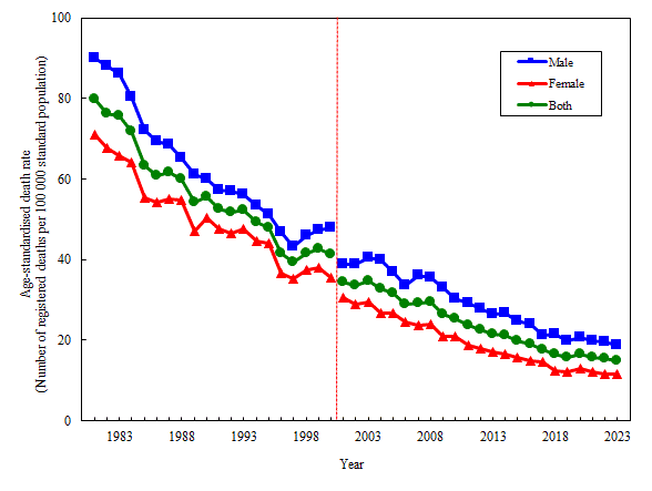 Age-standardised death rate of cerebrovascular disease by sex, 1981 to 2023
