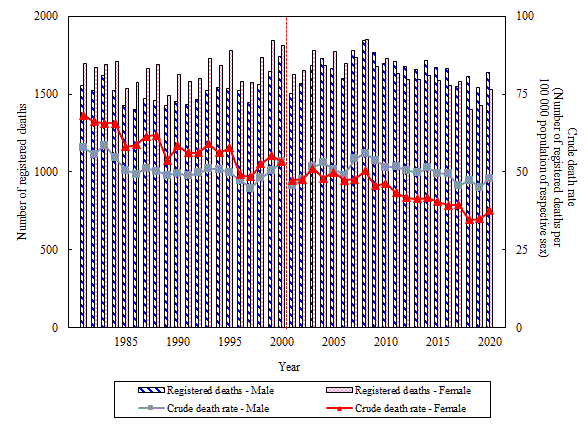 | Classification of diseases and causes of death is based on the International Statistical Classification of Diseases and Related Health Problems (ICD) 10th Revision from 2001 onwards. Figures from 2001 onwards may not be comparable with figures for previous years which were compiled based on the ICD 9th Revision. | ||