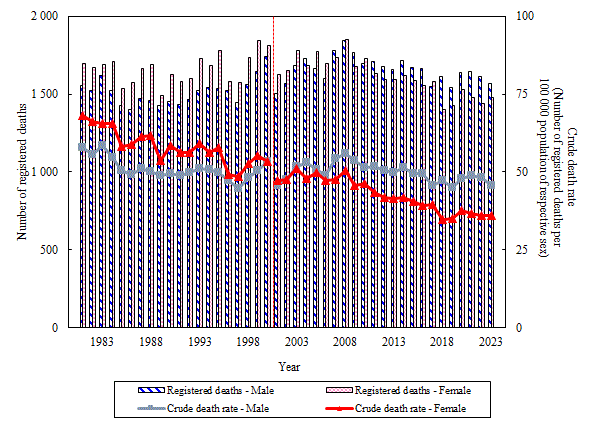 Number of registered deaths and crude death rate of cerebrovascular disease by sex, 1981 to 2023 (View)