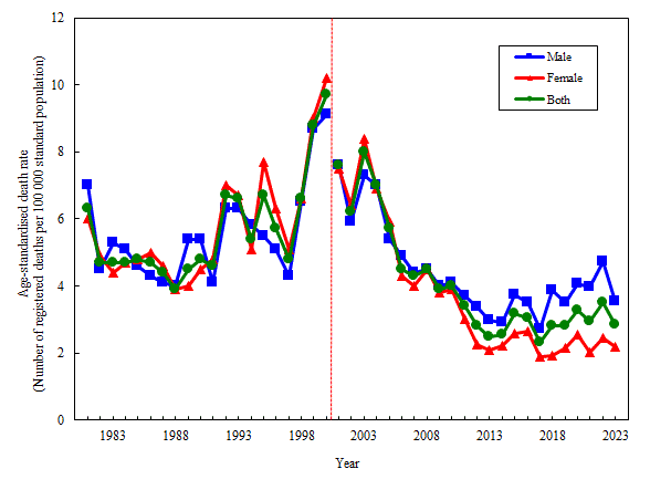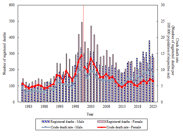 Classification of diseases and causes of death is based on the International Statistical Classification of Diseases and Related Health Problems (ICD) 10th Revision from 2001 onwards. Figures from 2001 onwards may not be comparable with figures for previous years which were compiled based on the ICD 9th Revision.
