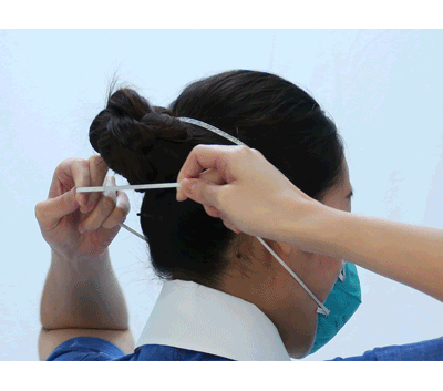 - Position the upper strap on head, and then pull the bottom strap below ears.
