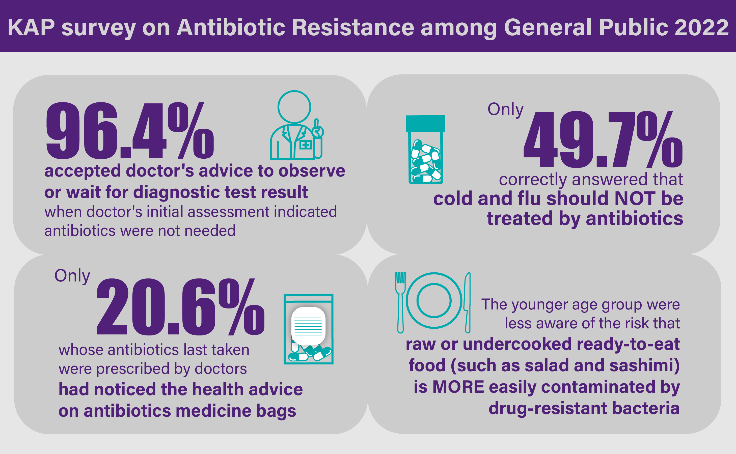 - Only less than half of the respondents knew that bacteria resistant to antibiotics could be spread from person to person. Public education on knowledge on AMR and related infection control practices should be enhanced.