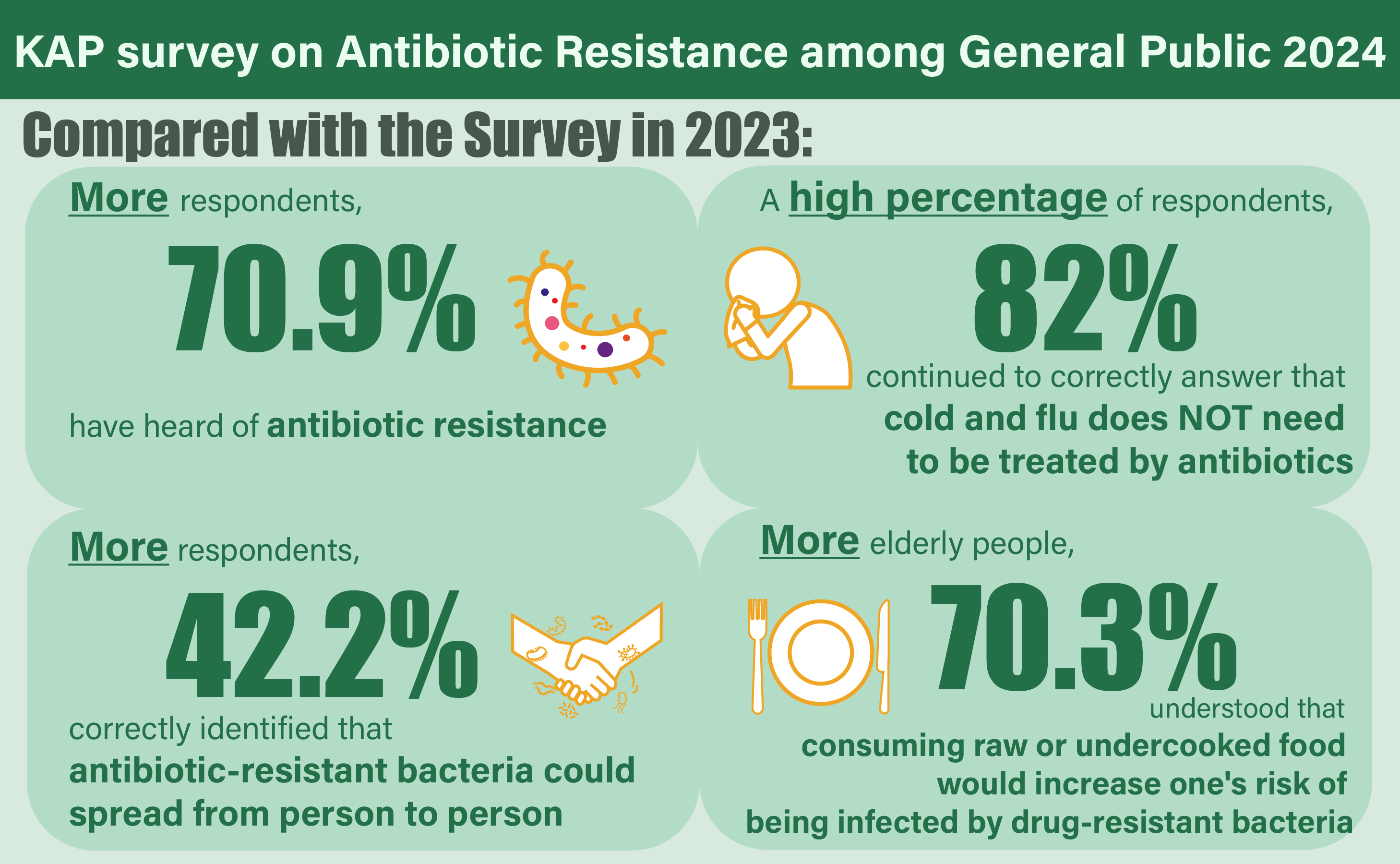 The Department of Health has made use of the findings of the 2023 KAP survey to formulate the key messages and promotion strategies for the 2024 World AMR Awareness Week. The 2024 KAP survey results showed improvements in the major gaps identified in the previous survey. This highlights that developing and implementing targeted, evidence-based health promotion programs is effective in increasing public awareness and actions against AMR. The current survey indicated the need for further improvement in public knowledge and practices on food safety to reduce the risk of infection from drug-resistant bacteria in food.