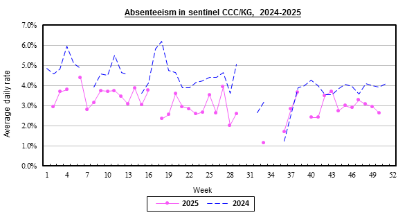 Weekly chart for surveillance of absenteeism due to sickness in sentinel CCC/KG, 2024-2025.  The average rate of absenteeism due to sickness in week 50 was 2.64%.